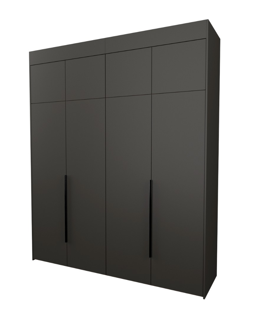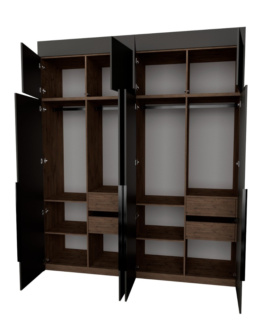 -Ручки открытия дверей из алюминиевого сплава в цвете черный хром с обработкой острых углов. Штанга для одежды в том же цвете с силиконовой вставкой для бесшумного использования при снятии вешалок.