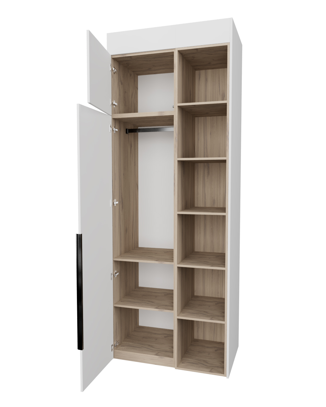 - Ручки открытия дверей из алюминиевого сплава в цвете черный хром с обработкой острых углов. Штанга для одежды в том же цвете с силиконовой вставкой для бесшумного использования при снятии вешалок.