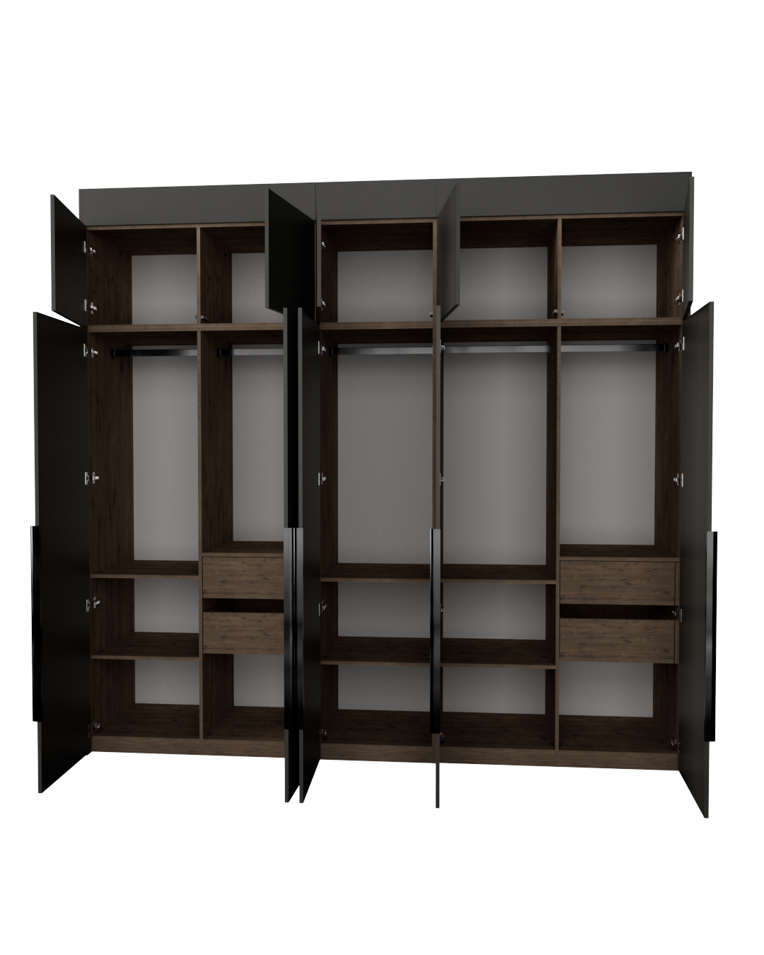 - Ручки открытия дверей из алюминиевого сплава в цвете черный хром с обработкой острых углов. Штанга для одежды в том же цвете с силиконовой вставкой для бесшумного использования при снятии вешалок.