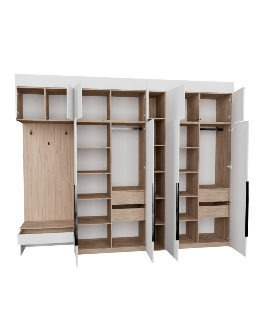 -Петли с доводчиком, направляющие скрытого монтажа установлены под ящиком, эстетический вид сбоку. Ящики антресолей дополнительно комплектуются механизмами открытия от нажатия «TipOn». Навесные ящики прихожей крепятся на прочные и долговечные механизмы с защитой от опрокидывания. Шкафы дополнительно укомплектованы регулируемыми металлическими опорами. Позволяют устранить все неровности по отношению к полу и собрать все элементы плотно между собой без видимых отверстий и перекосов.