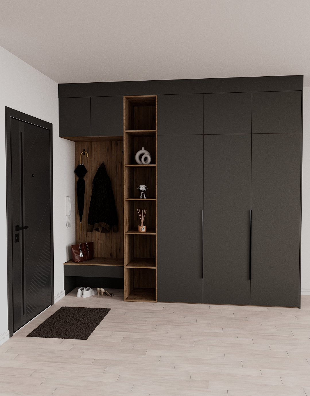 - Ручки открытия дверей из алюминиевого сплава в цвете черный хром с обработкой острых углов. Штанга для одежды в том же цвете с силиконовой вставкой для бесшумного использования при снятии вешалок.