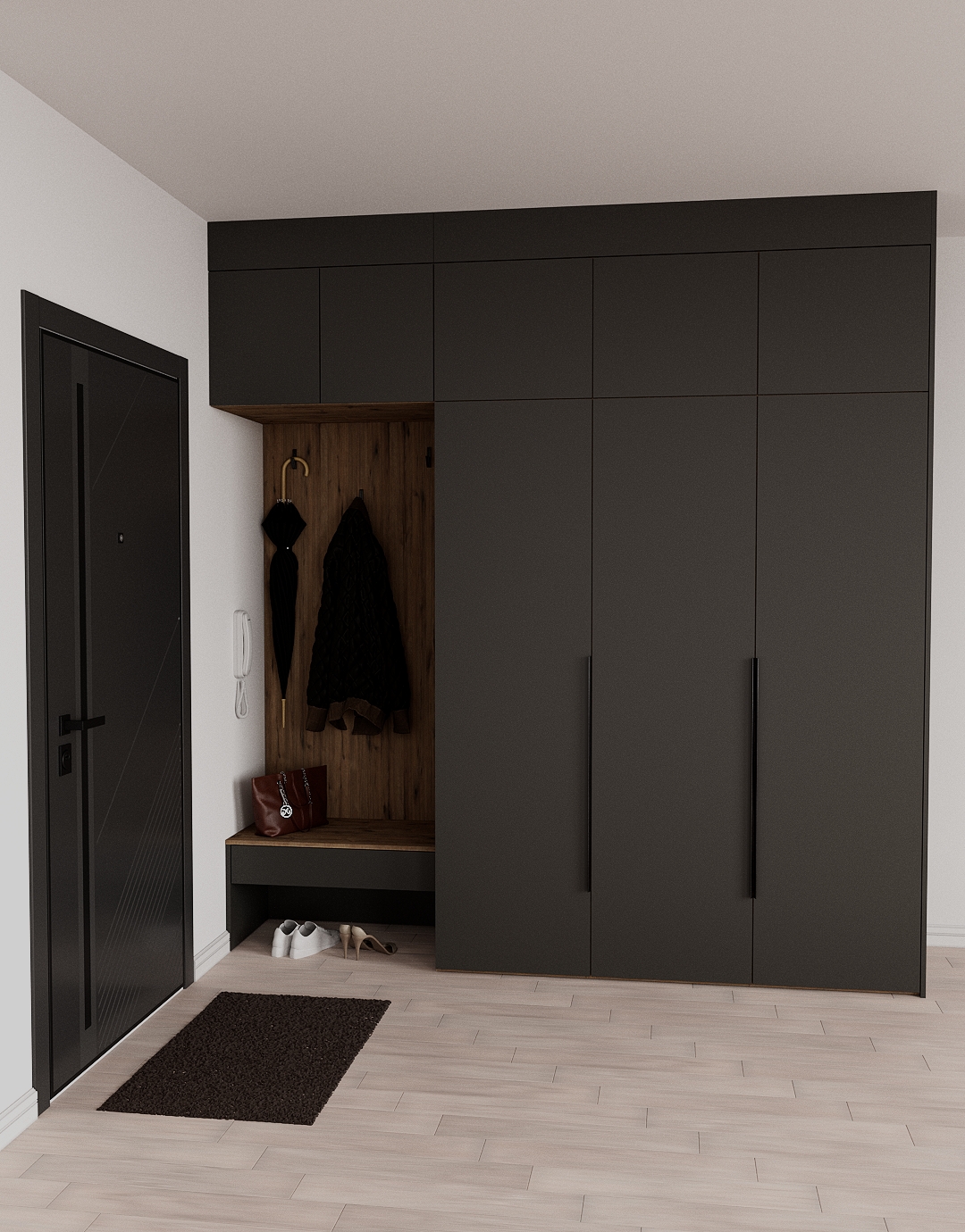- Ручки открытия дверей из алюминиевого сплава в цвете черный хром с обработкой острых углов. Штанга для одежды в том же цвете с силиконовой вставкой для бесшумного использования при снятии вешалок.