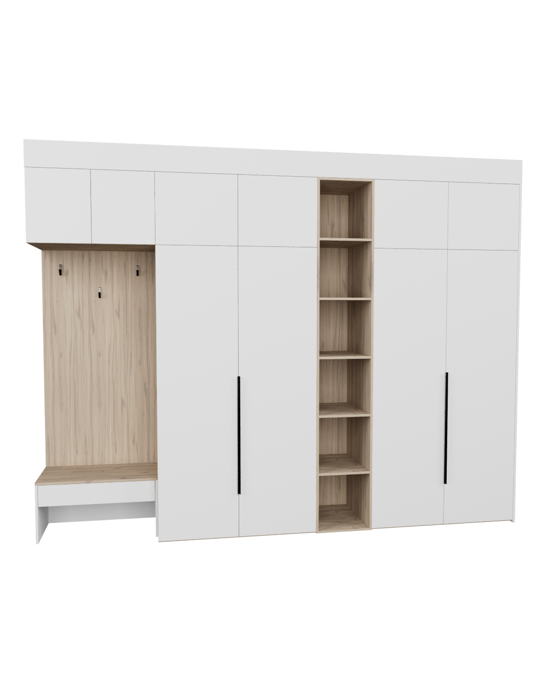 - Петли с доводчиком, направляющие скрытого монтажа установлены под ящиком, эстетический вид сбоку. Ящики антресолей дополнительно комплектуются механизмами открытия от нажатия «TipOn». Навесные ящики прихожей крепятся на прочные и долговечные механизмы с защитой от опрокидывания. Шкафы дополнительно укомплектованы регулируемыми металлическими опорами. Позволяют устранить все неровности по отношению к полу и собрать все элементы плотно между собой без видимых отверстий и перекосов.